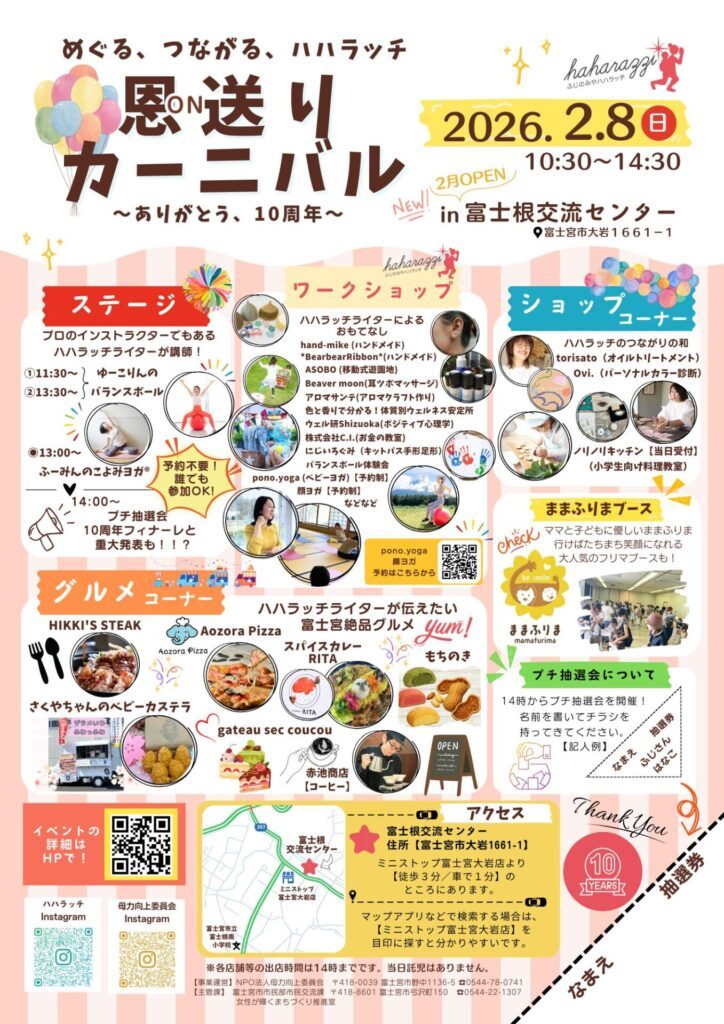 2026年2/8(日)、NPO法人母力向上委員会様の「恩送りカーニバル」に出店いたします。